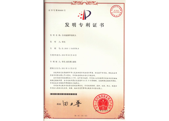 2010年申請2011年授權自動氬弧焊接機頭(發明)