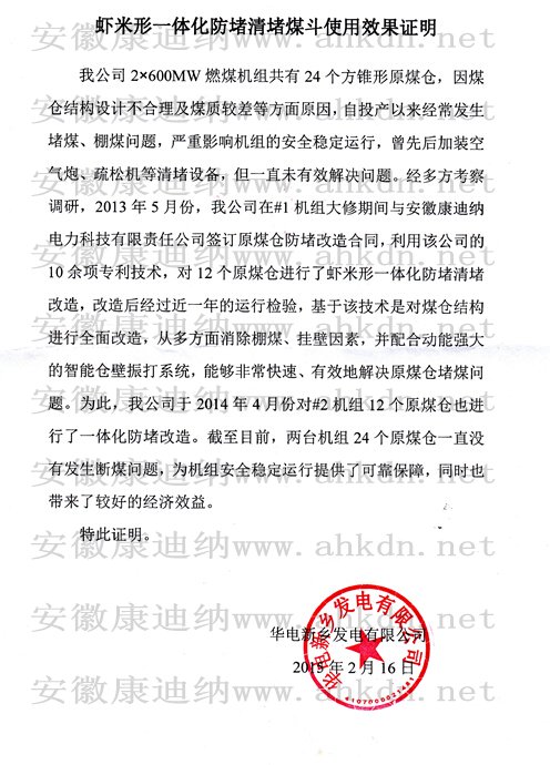 我公司原來的原煤機(jī),因煤倉結(jié)構(gòu)設(shè)計不合理及煤質(zhì)較差等方面的原因,經(jīng)常發(fā)生堵煤、棚煤的問題,自從公司與安徽康迪納電力科技有限責(zé)任公司簽訂原煤倉防堵改造合同,利用該公司的技術(shù),解決了一系列的問題,我公司現(xiàn)在經(jīng)濟(jì)效益蒸蒸日上,非常感謝康迪納有限公司。