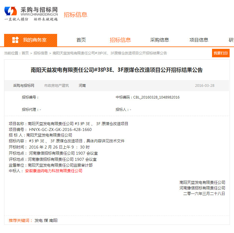 南陽天益發(fā)電有限責(zé)任公司#3爐3E、3F原煤倉改造項(xiàng)目中標(biāo)公示