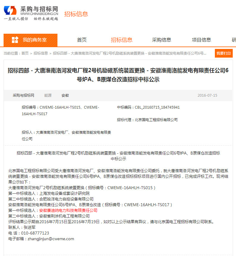 恭喜我公司在大唐淮南漯河發(fā)電廠程2號激勵磁系統(tǒng)裝置更換-安徽淮南洛能發(fā)電有限責(zé)任公司6號爐A、B原煤倉改造招標(biāo)結(jié)果。