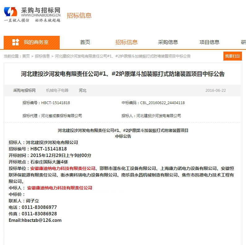 河北建投沙河發電有限責任公司#1、#2爐原煤斗加裝振打式防堵裝置項目中標公告