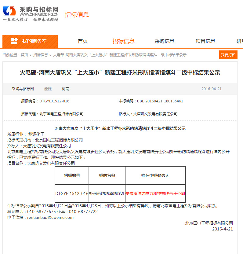 火電部-河南大唐鞏義“上大壓小”新建工程蝦米形防堵清堵煤斗二級中標結果公示